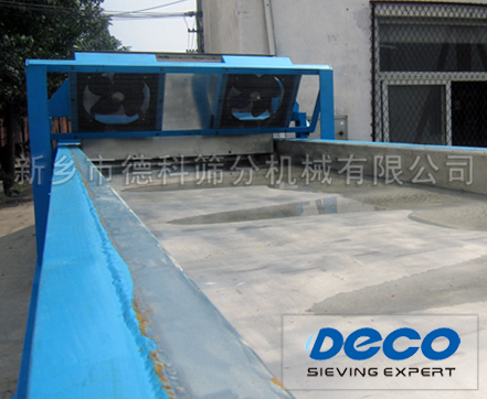 冷卻系統是由振動給料機輸送槽面下部,一個封閉的箱體組成,在設備兩端分別設置有進水口和出水口,通過冷水循環使得可以一直使用較低的水溫對物料進行冷卻處理。在物料通過輸送槽體平面時,箱體內的水對平面上的物料進行充分冷卻。槽體兩側設計有若干個出風口,對物料進行風冷降溫處理。物料在設備上通過振動到達設備末端,設有網孔篩板,進行簡單篩分,去除不合格的產品。